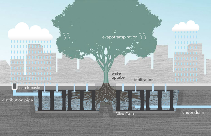 Serving a dual purpose, Silva Cells are a stormwater management feature that also supports tree growth.